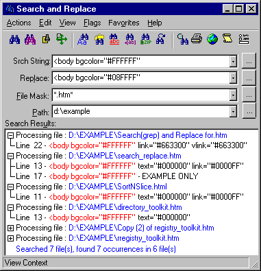 功能超強的查找與替換工具。它可以對同一硬碟中的所有檔進行搜索與替換,也可以搜索